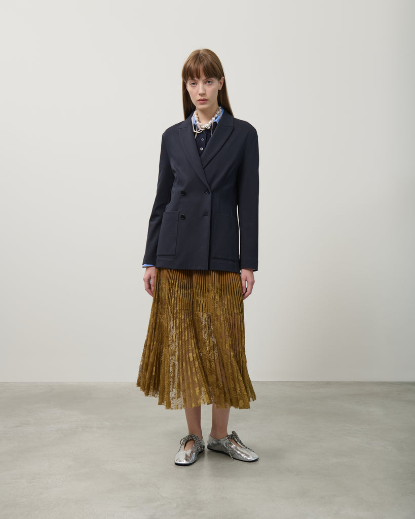 Giacca realizzata in punto Milano, over presenta un'abbottonatura doppiopetto con revers a lancia, bottoni a vista in tono e tasche a toppa. Le maniche solo lunghe e regular. Vestibilità regolare.