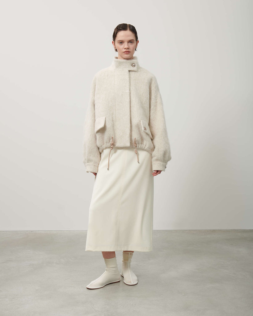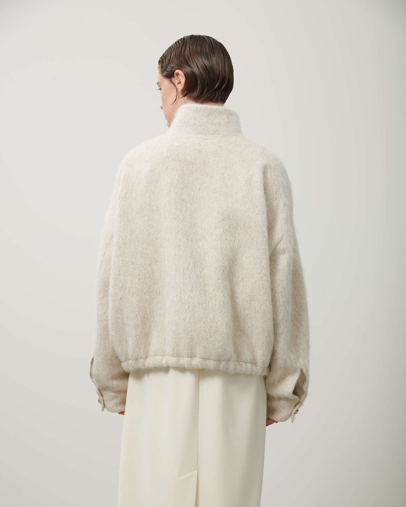 Questo bomber realizzato in un mix di lana, mohair e alpaca spazzolato si distingue per la sua silhouette contemporanea. Presenta un collo alto con chiusura a bottoni a vista, maniche lunghe con polsini alti e tasche con patta con patch in pelle tono su tono che completano il modello. La coulisse sul fondo permette di creare volumi contemporanei. Vestibilità over