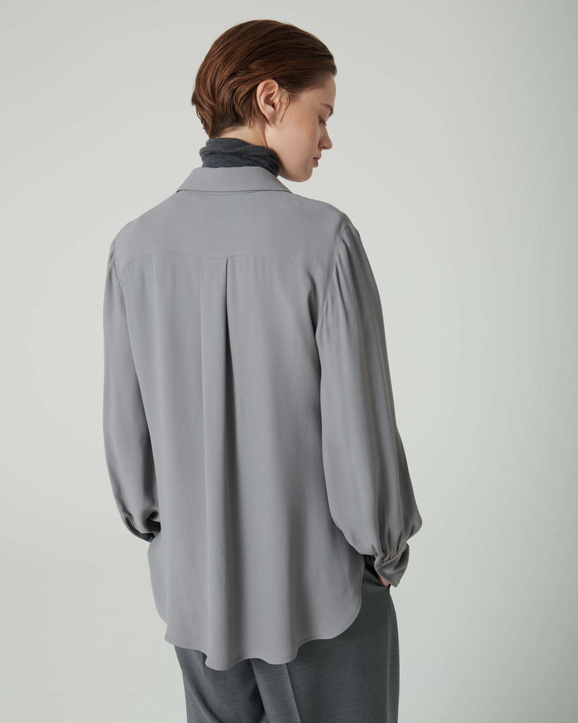 Questa camicia in georgette di viscosa presenta volume morbido e fluido. È caratterizzata da un collo classico, maniche lunghe con polso alto e carrè dietro con faldone centrale. L'apertura frontale con bottoni a vista rifinisce il modello, mentre il taschino sul petto con ricamo fatto a mano con strass. Vestibilità regolare.