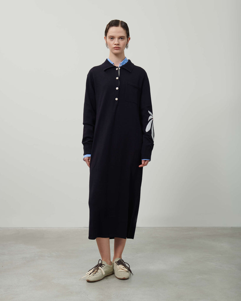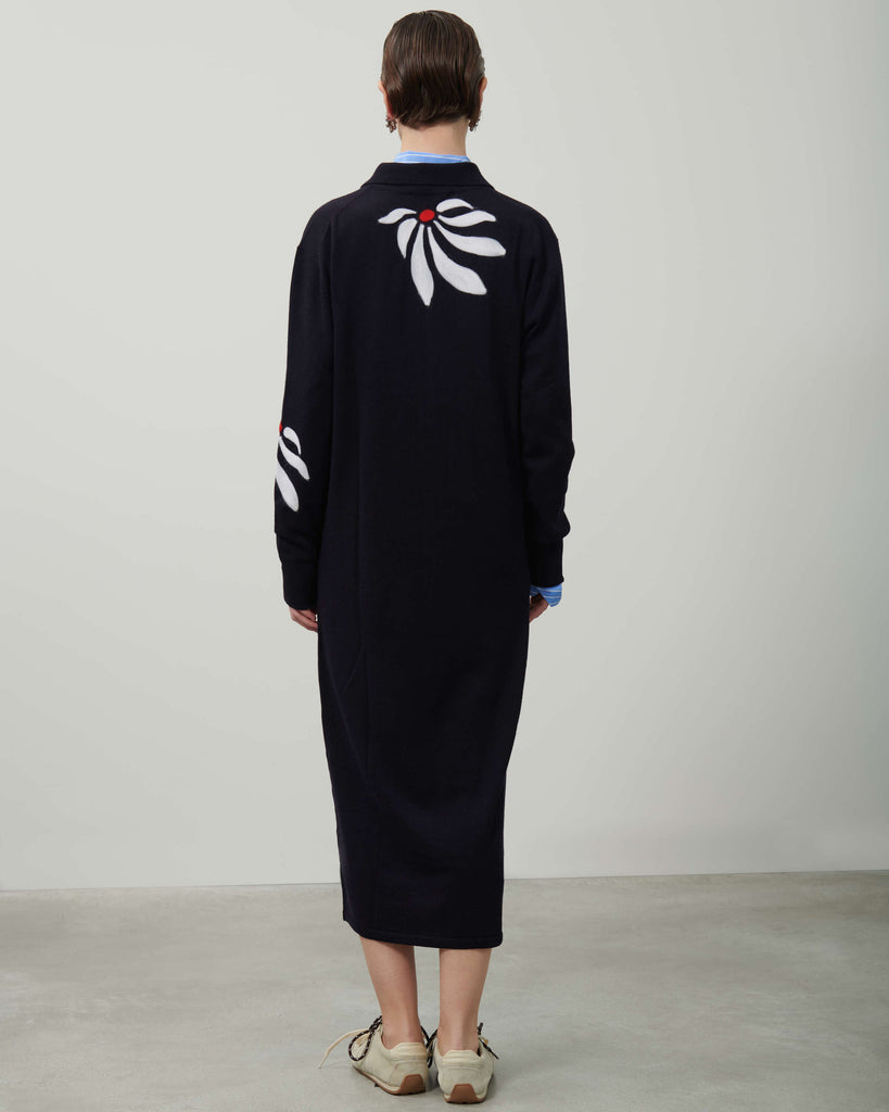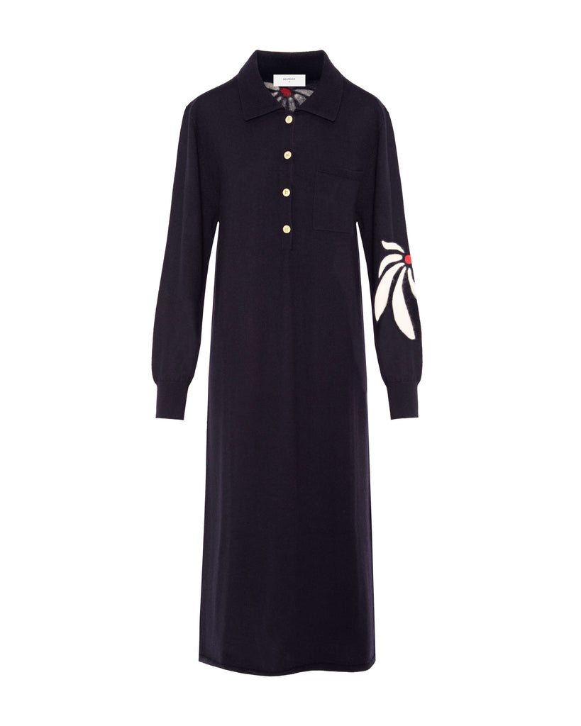 Abito midi realizzato in lana, con collo a polo, apertura frontale con bottoni a vista, maniche lunghe e taschino sul petto. Con macro fiori colorati agugliati. Vestibilità regolare.