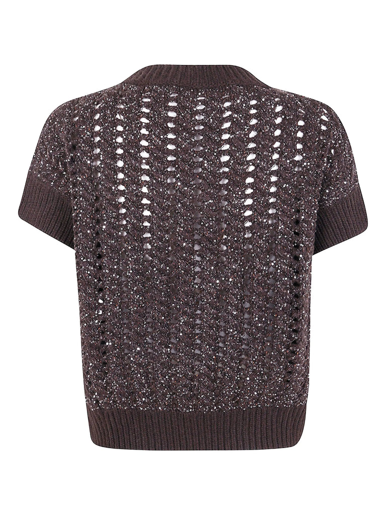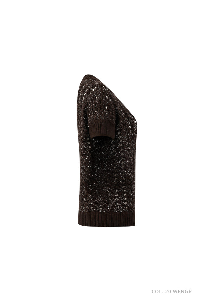 Gilet a girocollo realizzato in prezioso filato con paillettes, impreziosito da una sofisticata lavorazione traforata. Un capo elegante e luminoso. Vestibilità regolare