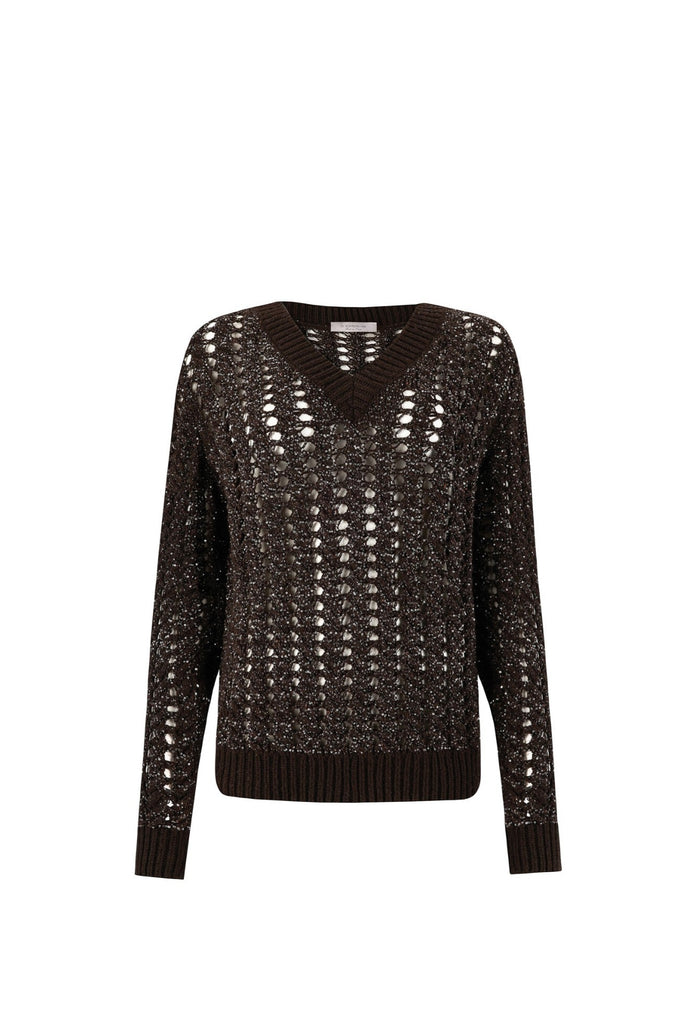 Maglia traforata a maniche lunghe con scollo a V, impreziosita da una lavorazione particolare realizzata in pregiato filato con paillettes. Un capo elegante e luminoso, perfetto per arricchire i look con stile e raffinatezza. Vestibilità regolare.