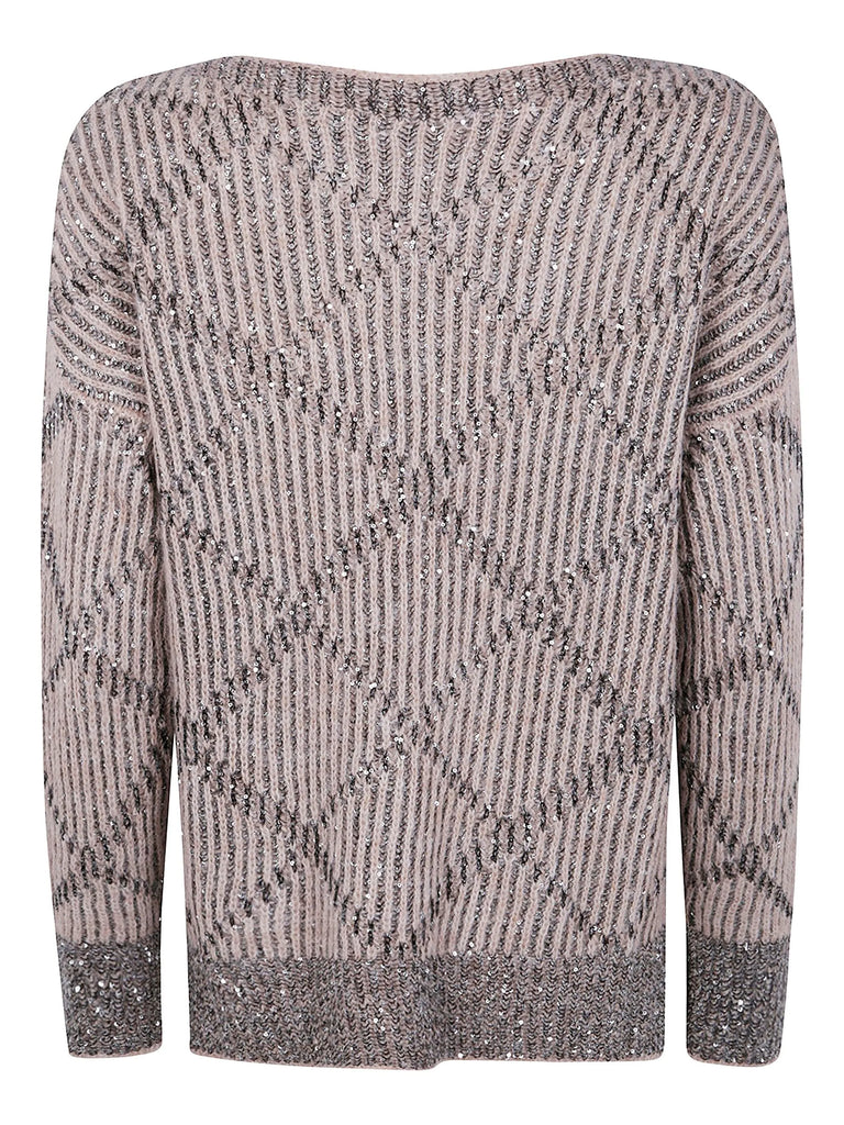 Maglia a maniche lunghe in filato con paillettes, impreziosita da uno scollo a barchetta e da una sofisticata lavorazione a rombi. La combinazione di luce e texture conferisce al capo un’eleganza discreta e raffinata. Vestibilità regolare.