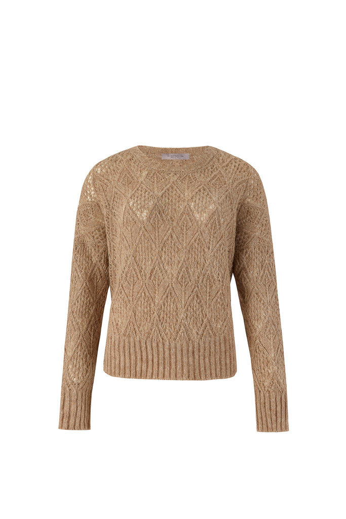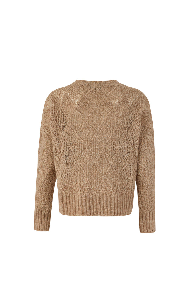 Maglia corta girocollo, lavorazione traforata con bordi a costine, impreziosita da inserti in lurex. Vestibilità regolare.