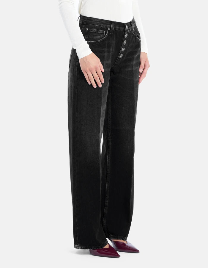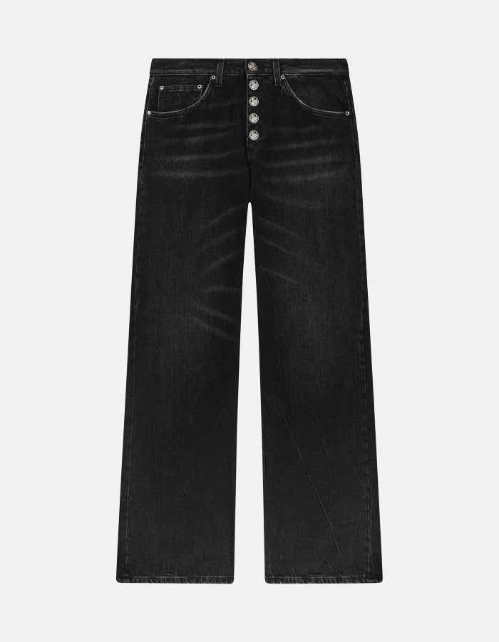 Jeans Jacklyn cinque tasche wide leg fit, vita bassa, gamba a palazzo. Bottoniera gioiello. Denim fisso responsabile black black 12.50 oz. Lavaggio nero vintage pulito. Logo Dondup.