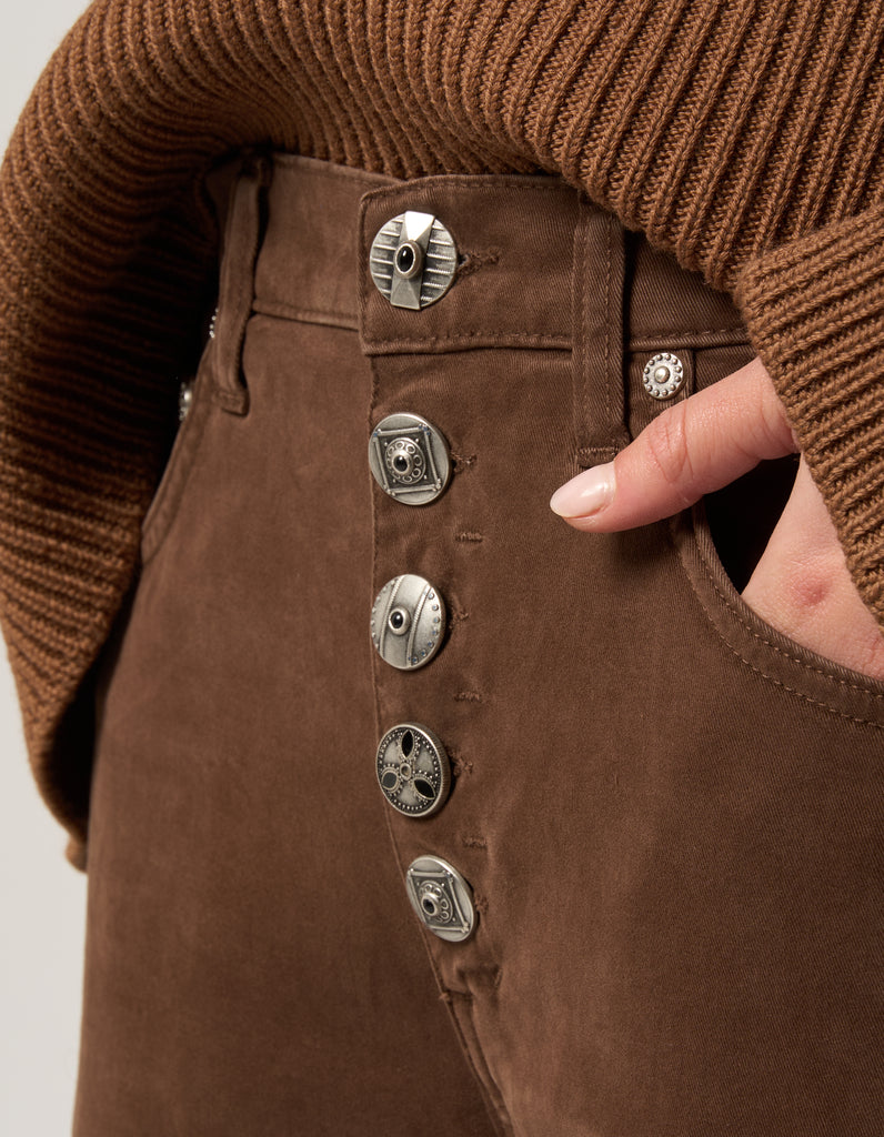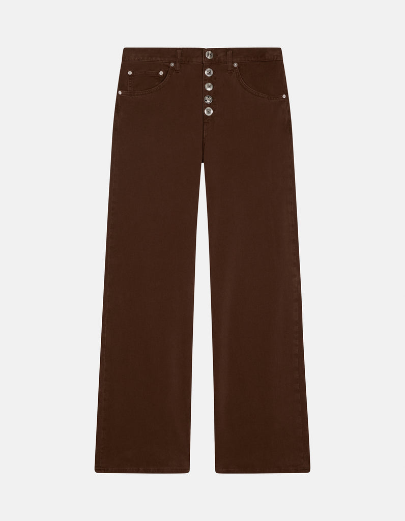 Pantaloni Jacklyn cinque tasche gamba larga fit, vita bassa, gamba a palazzo, bottoniera gioiello. La tintura in capo dona sfumature uniche e un effetto vissuto di grande tendenza, salpa multicolor. Logo Dondup