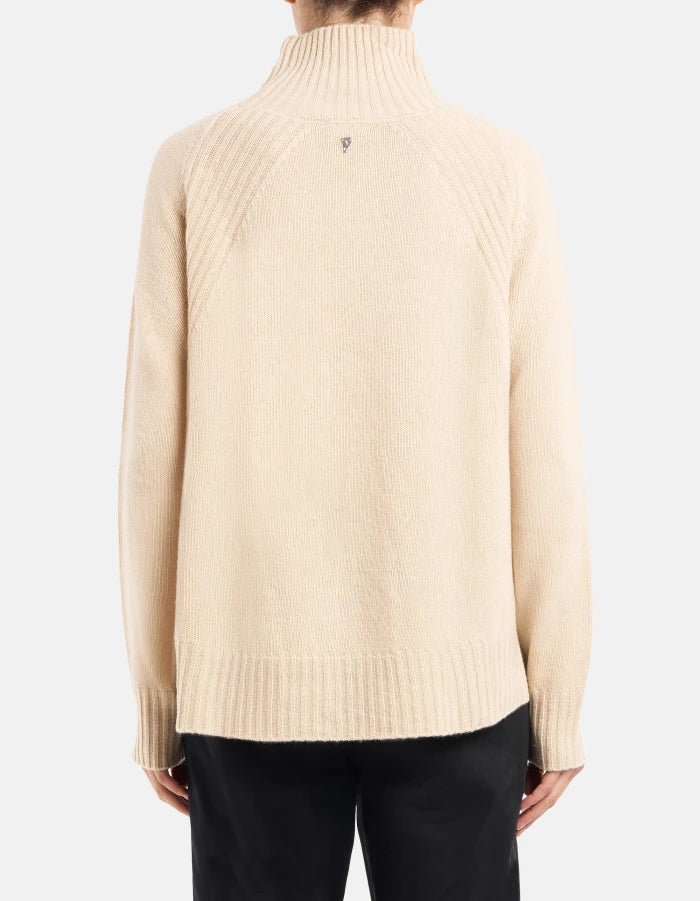 Maglia dolcevita regular a maniche lunghe, con giochi di punti fondo asimmetrico e logo applicato sul dietro. Lana cashmere. Logo Dondup.