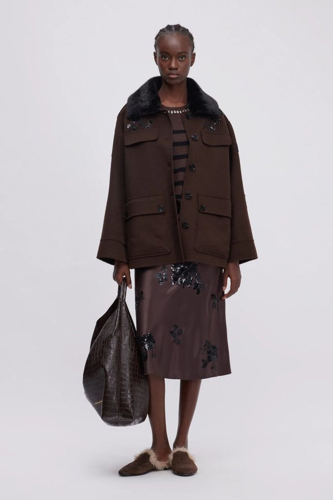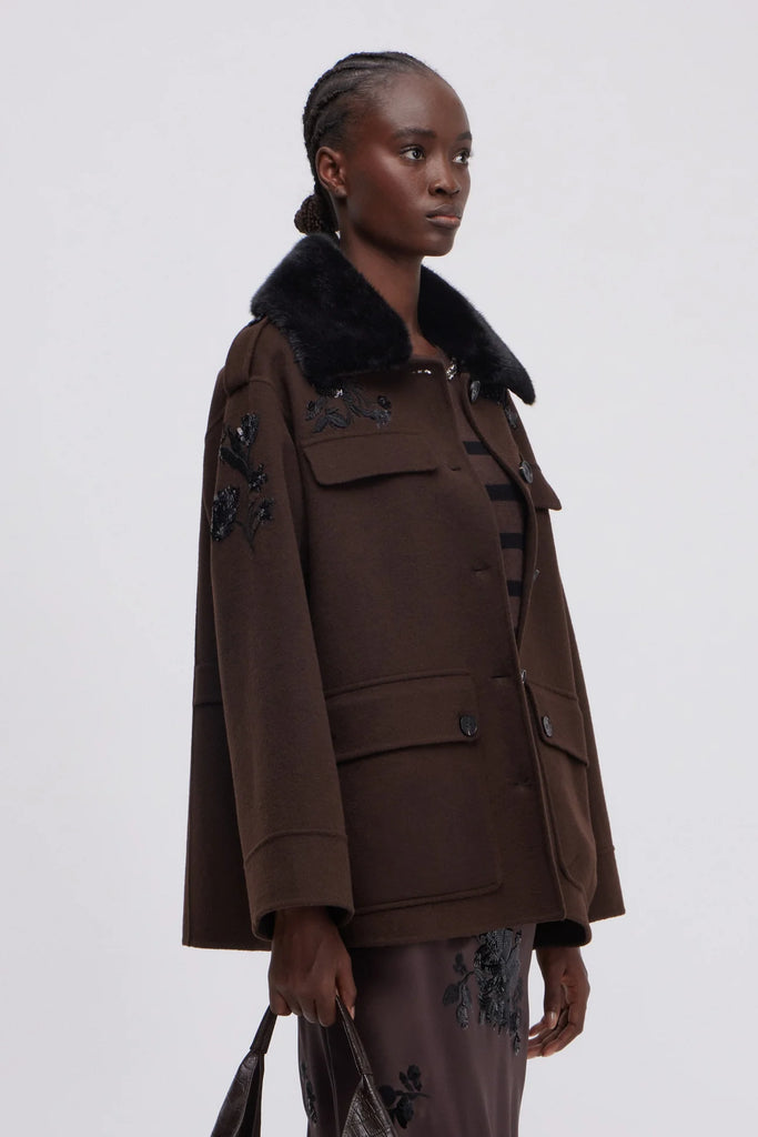 Caban in panno di lana double sfoderato con collo staccabile in visone ecologico nero e preziosi ricami di paillettes nere. Volume morbido tipo mantella con ampi spacchi laterali e tasche a toppa davanti. La vestibilità di questo capo è leggermente oversize, si consiglia di acquistare una taglia in meno per una vestibilità più regolare.