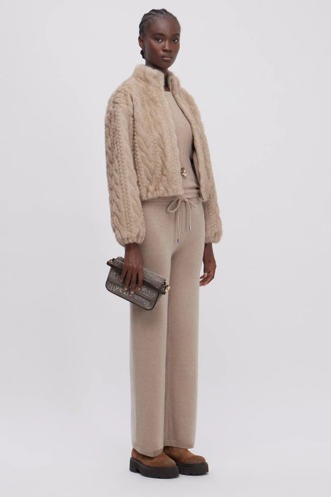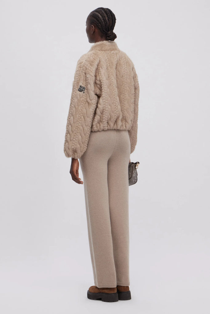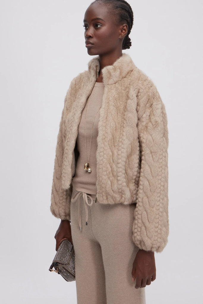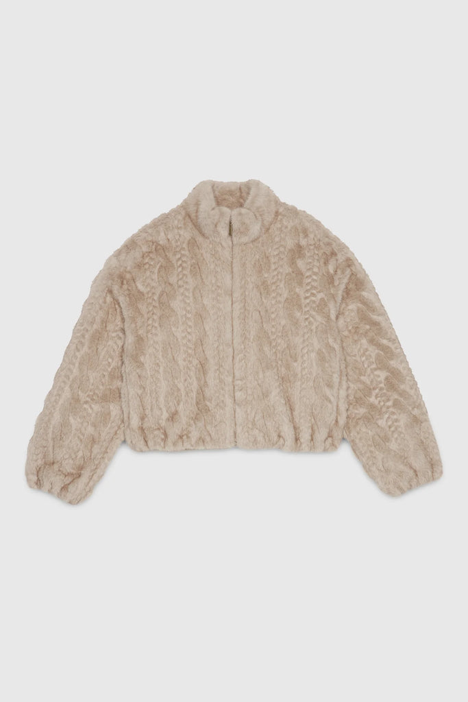 Bomber in montone ecologico con morbido pelo lavorato effetto tricot con motivi a trecce all'esterno di un bellissimo colore sabbia melange interno nappato. Chiusura con zip e logo gioiello con pietre crystal sulla manica. Fondo e polsi con elastico interno per un look più sportivo. La vestibilità di questo capo è regolare, si consiglia di acquistare la taglia abituale.