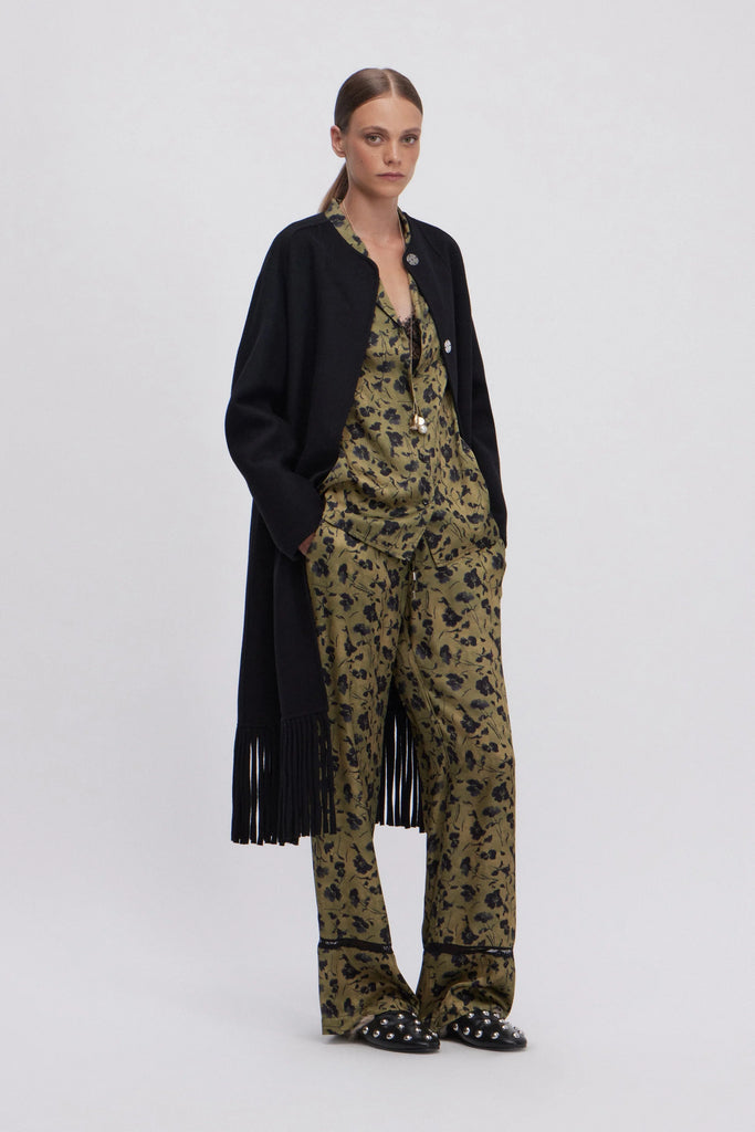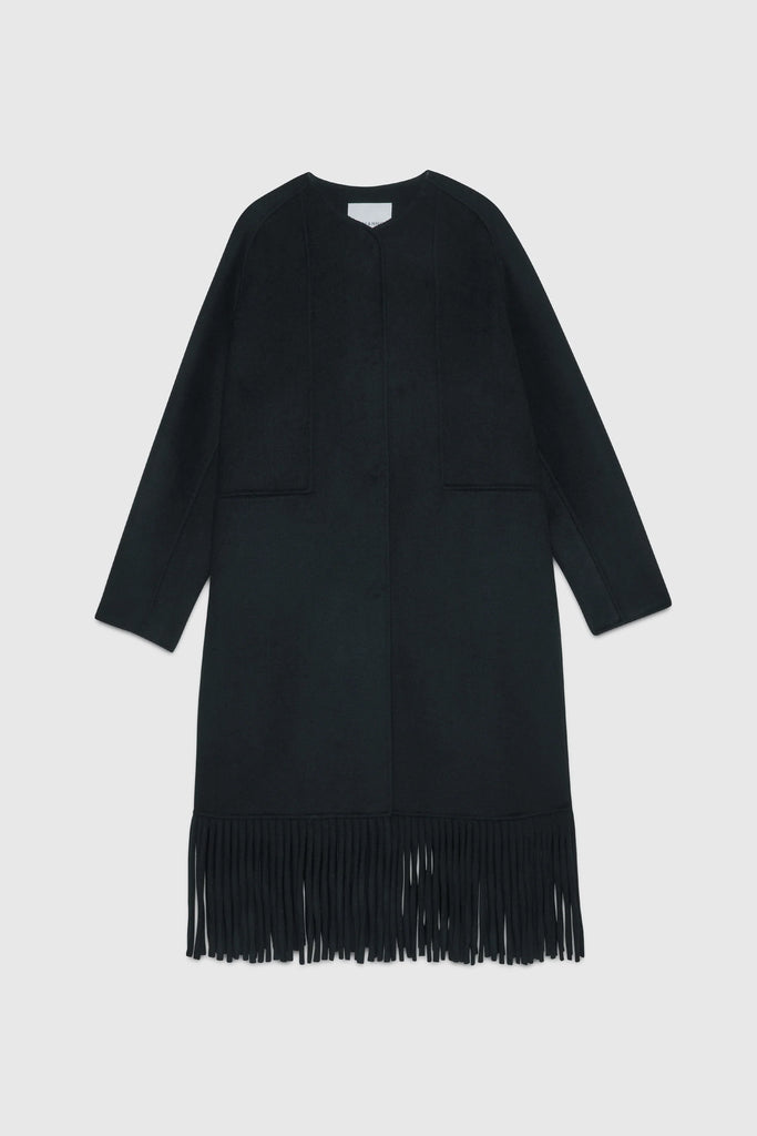 Cappotto over a girocollo in panno double di lana. Chiusura con bottoni interni in metallo a pressione. Tasche a filetto e ricca frangia di panno sul fondo. La vestibilità di questo capo è oversize, si consiglia di acquistare una taglia in meno di quella abituale.