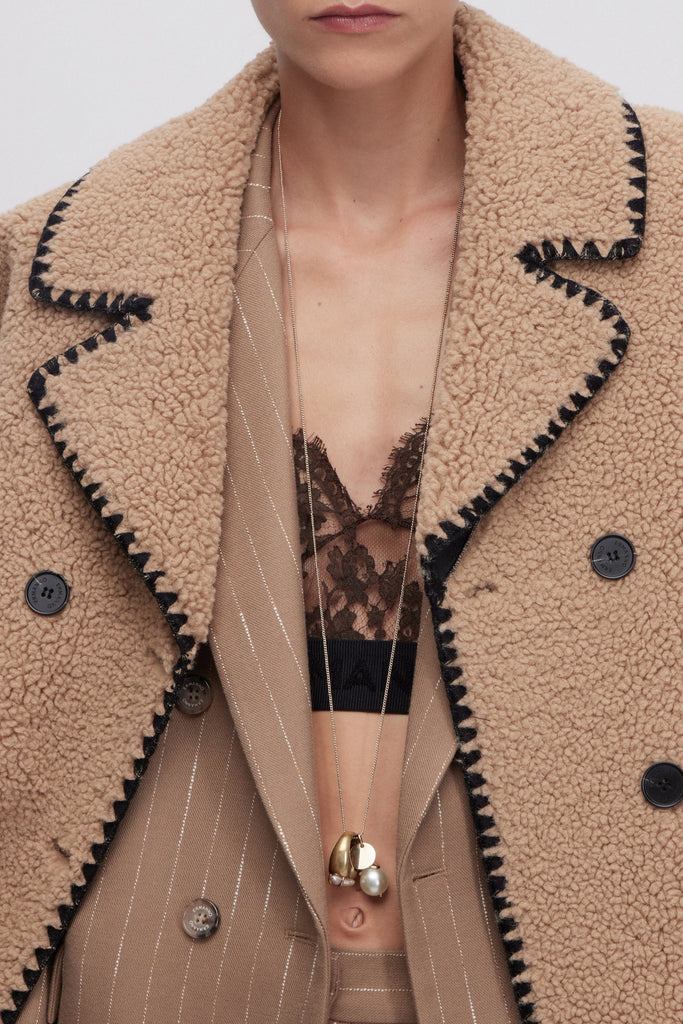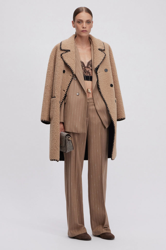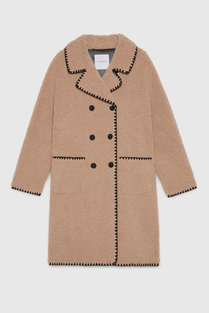 Cappotto midi a doppio petto in montone ecologico con esterno in morbido ricciolino cammello e interno nappato nero. Profili ricamati in nero, tasche a toppa, etichetta logo in macramè sul retro. La vestibilità di questo capo è regolare, si consiglia di acquistare la taglia abituale.