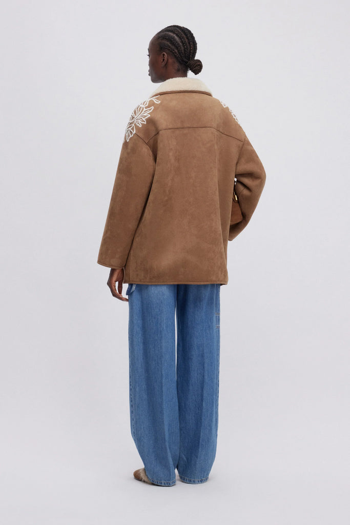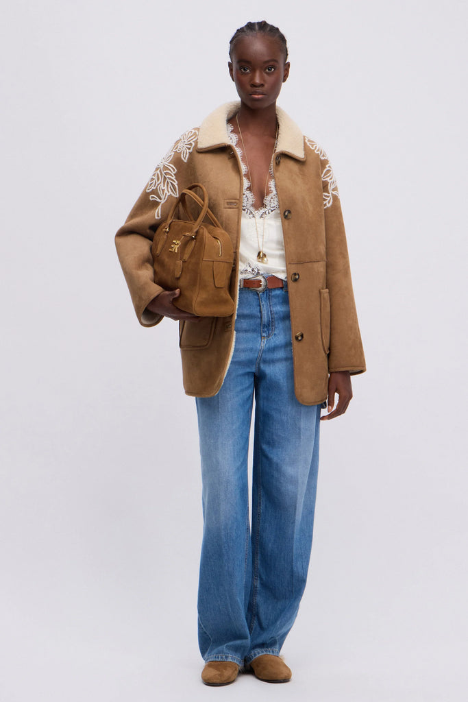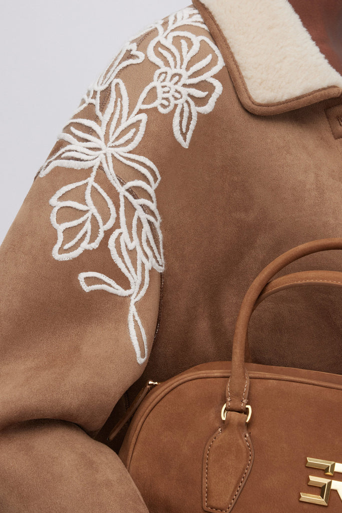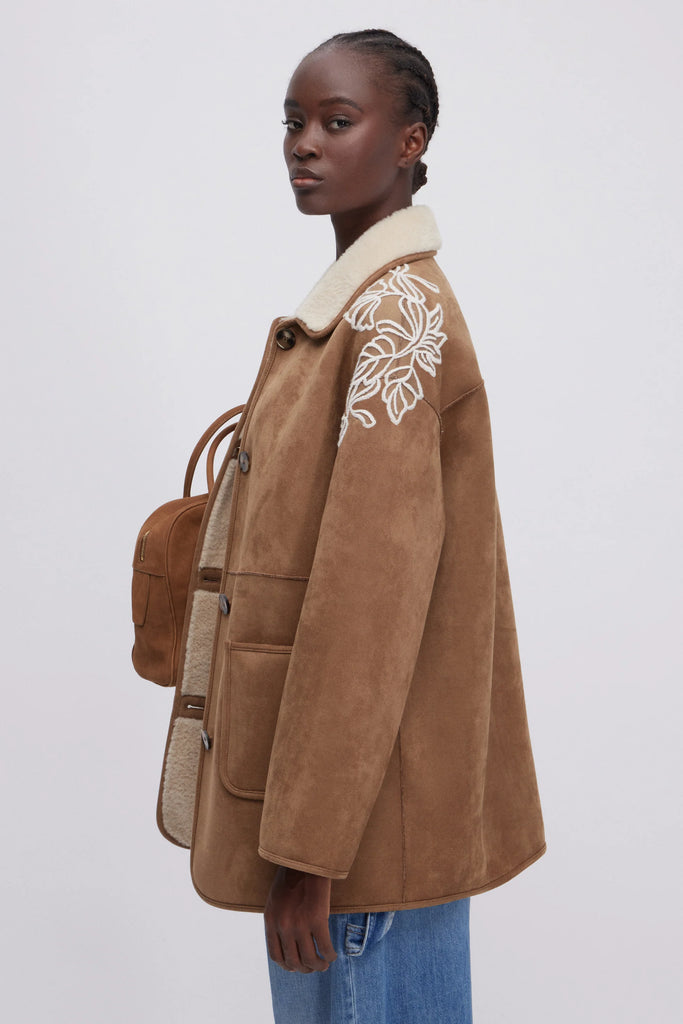 Giaccone in montone ecologico scamosciato colore cammello con collo e interno in morbida pelliccia ecologica off white. Tasche a toppa e prezioso ricamo in lana in contrasto sulle spalle. La vestibilità di questo capo è regolare, si consiglia di acquistare la taglia abituale.