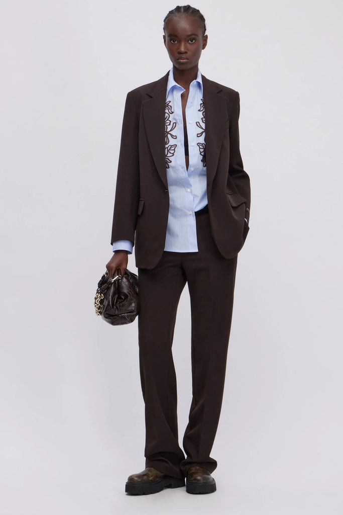 Camicia in popeline di cotone a righe bianche e azzurre con ricamo in lana marrone in contrasto. Volume morbido leggermente over. La vestibilità di questo capo è leggermente oversize, si consiglia di acquistare una taglia in meno per una vestibilità più regolare.