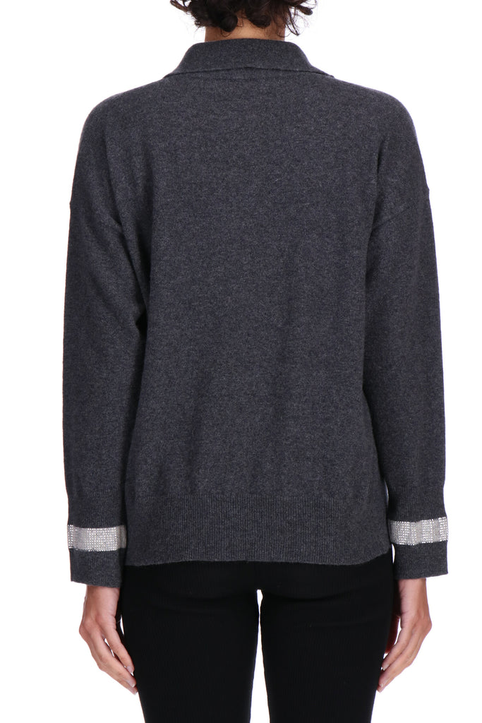 Maglia polo oversize a maniche lunghe realizzata in misto lana con colletto classico, scollo a V, taschino applicato con logo in strass, fondo manica con strass argento. La vestibilità di questo capo è leggermente oversize, si consiglia di acquistare una taglia in meno per una vestibilità più regolare.