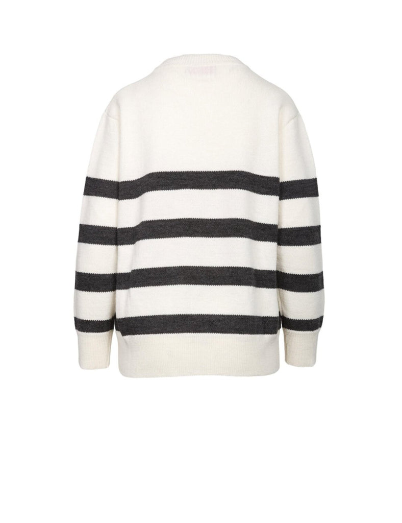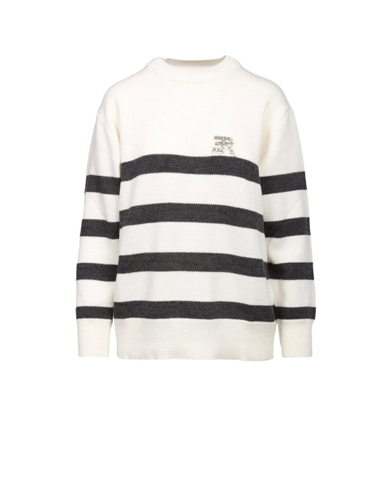 Maglia oversize girocollo a righe con logo gioiello di cristalli ricamati. La vestibilità di questo capo è regolare, si consiglia di acquistare la taglia abituale.