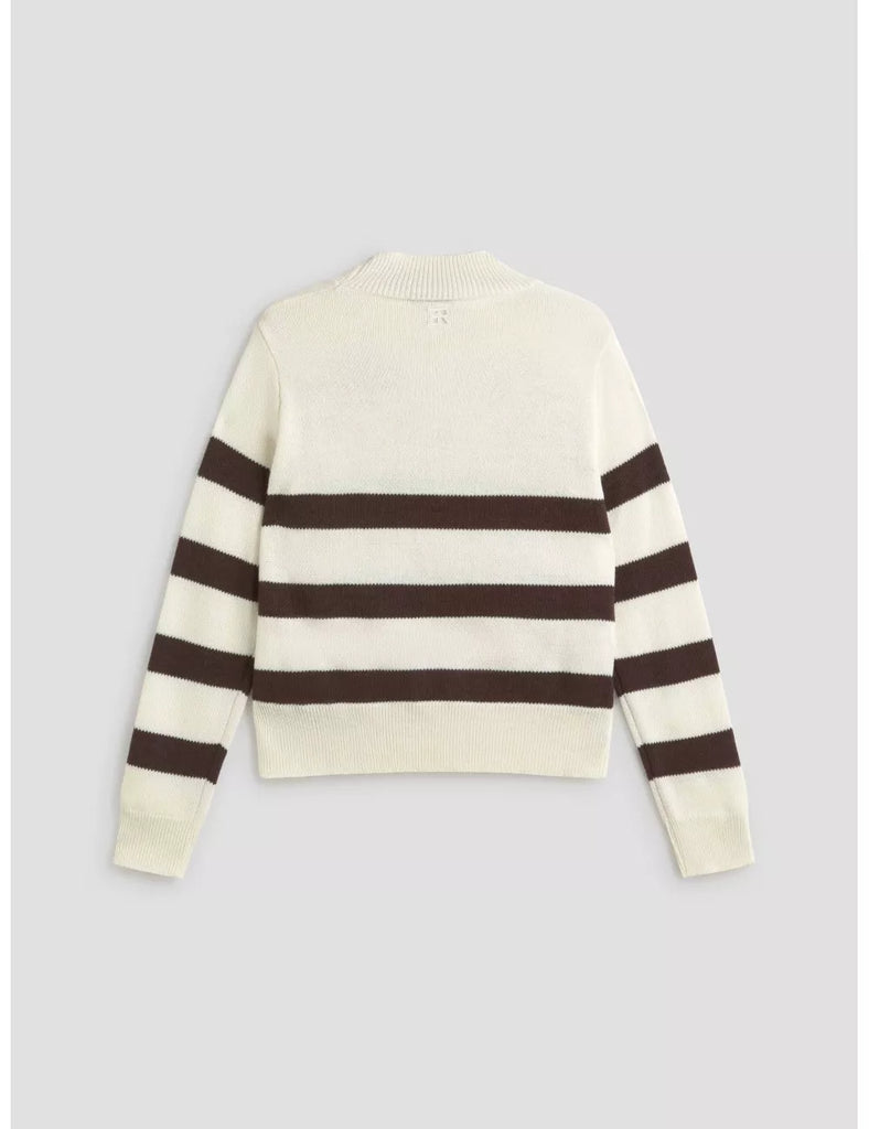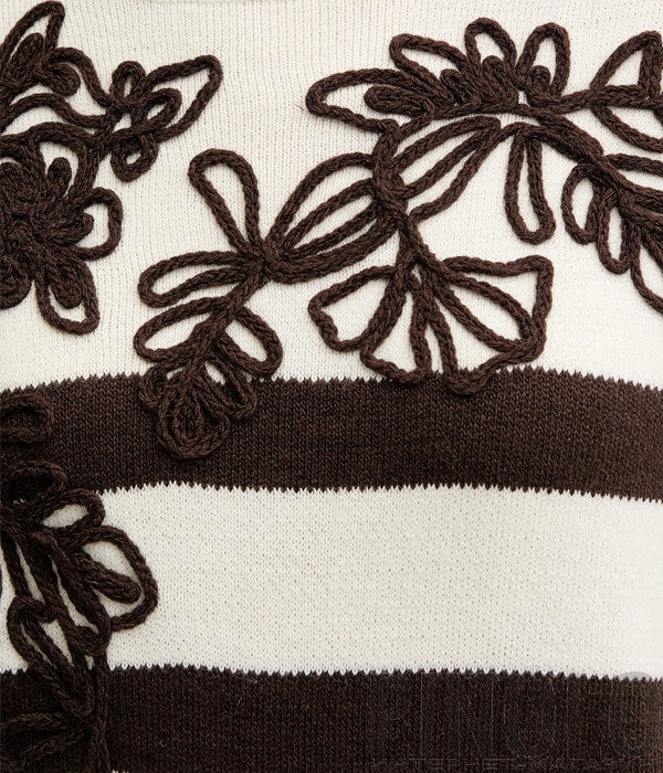 Maglia collo alto, bianco con ampie righe marroni su corpo e maniche. Presenta un ricamo floreale marrone in lana sulla parte anteriore. La vestibilità di questo capo è regolare, si consiglia di acquistare la taglia abituale.