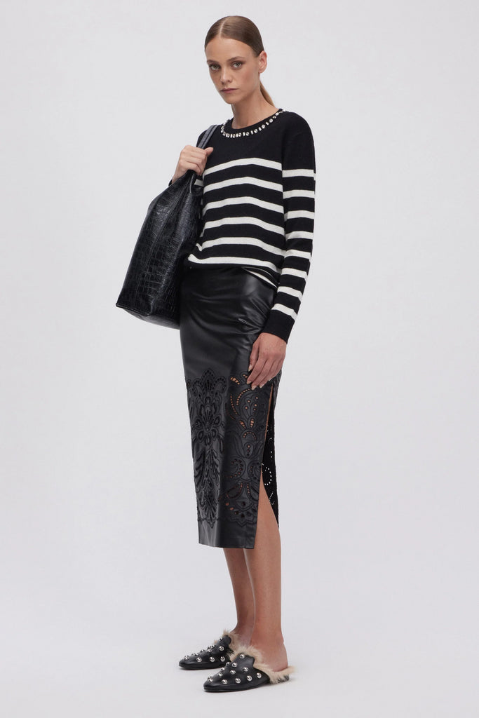 Gonna longuette in ecopelle con ricamo san gallo tono su tono. Linea dritta e spacco sul fianco sinistro. La vestibilità di questo capo è regolare, si consiglia di acquistare la taglia abituale.