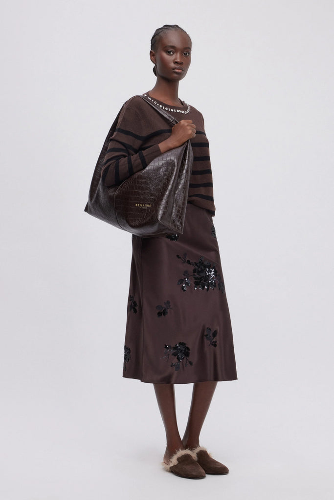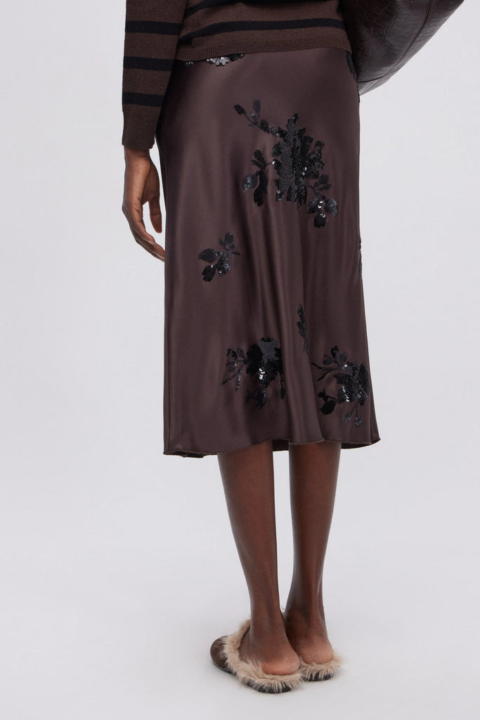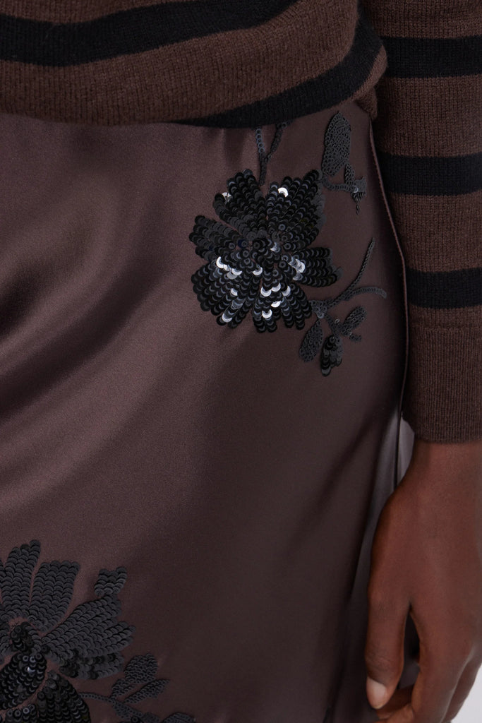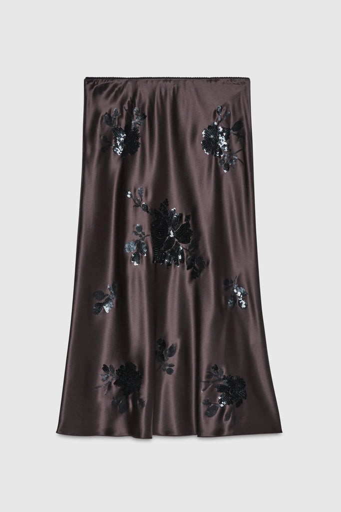 Gonna longuette svasata di raso in sbieco con fiori ricamati di paillettes nere in contrasto. Elastico in vita. La vestibilità di questo capo è regolare, si consiglia di acquistare la taglia abituale.
