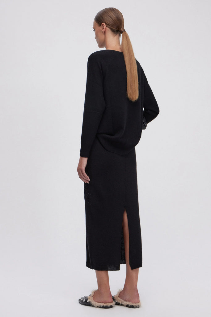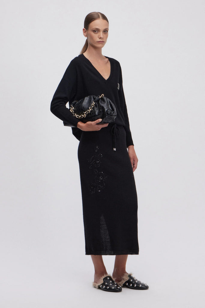 Gonna longuette in maglia di lana compatta, con elastico in vita e coulisse. Tralci di fiori in pizzo rebrodè con micropaillettes tono su tono impreziosiscono il capo. La vestibilità di questo capo è regolare, si consiglia di acquistare la taglia abituale.