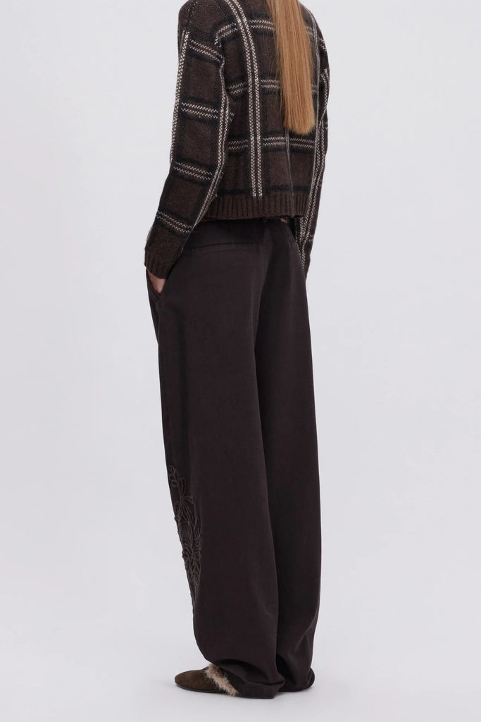 Pantaloni balloon ampi in bull di cotone con ricami in lana in tono. Cavallo leggermente sceso, tasche a filetto dietro e gamba dritta. La vestibilità di questo capo è oversize, si consiglia di acquistare una taglia in meno di quella abituale.