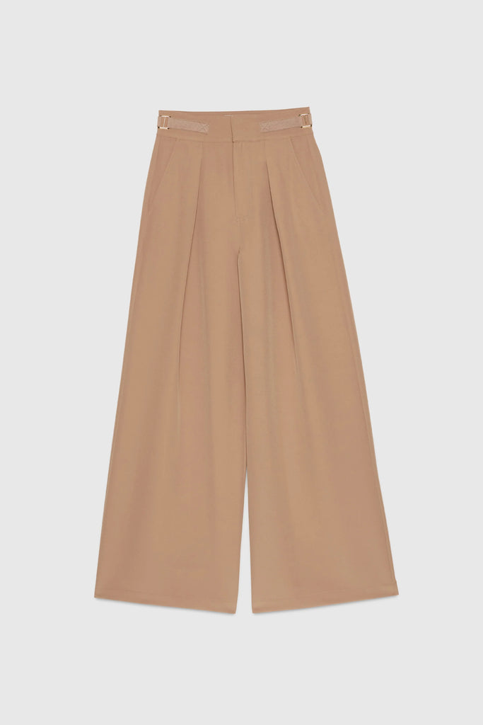 Pantaloni ampi in cadì con piega davanti e cinturino con fibbie. Gancio interno in vita e zip. Tasche a filetto dietro. La vestibilità di questo capo è regolare, si consiglia di acquistare la taglia abituale.