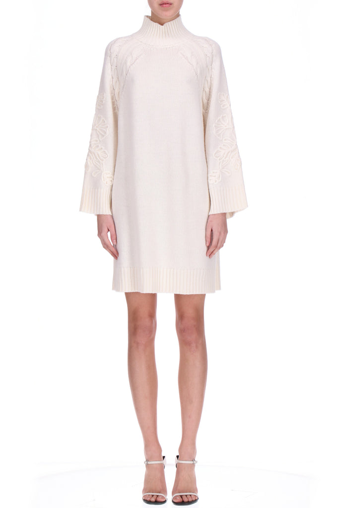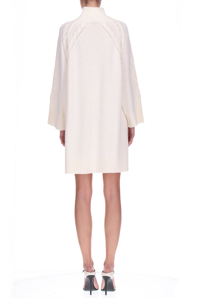 Abito corto a collo alto con ampie maniche a raglan con motivo a trecce. Le maniche sono arricchite da fiori ricamati tono su tono in lana. La vestibilità di questo capo è leggermernte oversize.