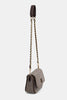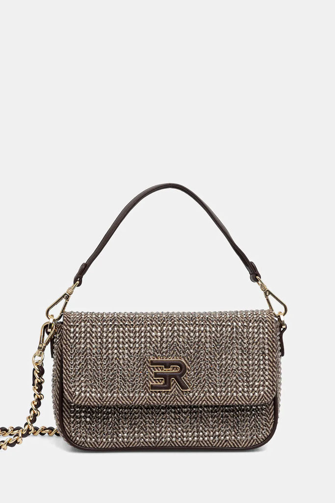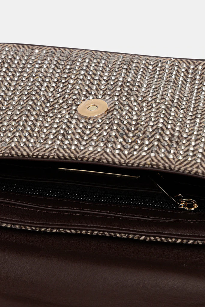 Tracolla piccola in tessuto maschile spinato testa di moro e off white con applicazione di cristalli fumé. Profili e tracolla regolabile di ecopelle testa di moro. Tasca interna.