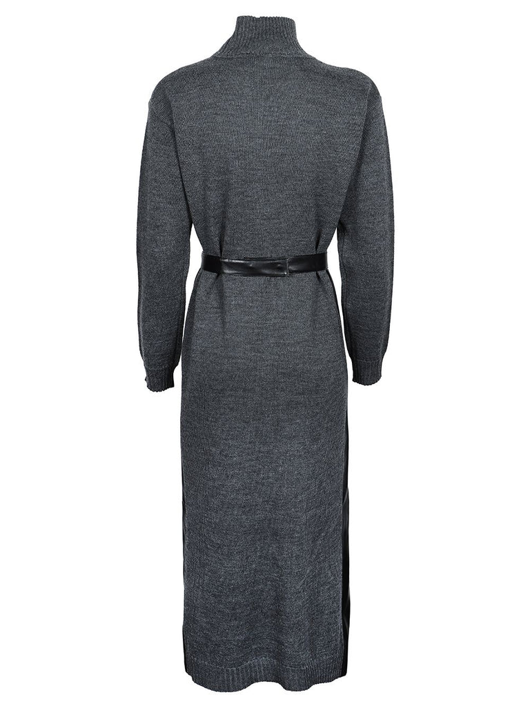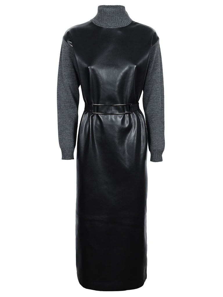 Abito nero loungutte morbido in pelle vegana con manica lunga e collo alto in maglia nel core grigio.