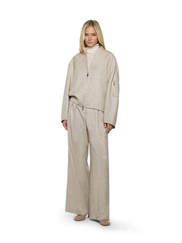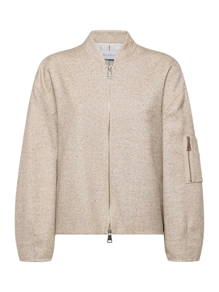 Bomber in tessuto a spina di pesce con strass. Collo alla coreana, chiusura frontale con zip e tasche laterali. Maniche con polsini e pinces. Carré ed elastico sul retro.