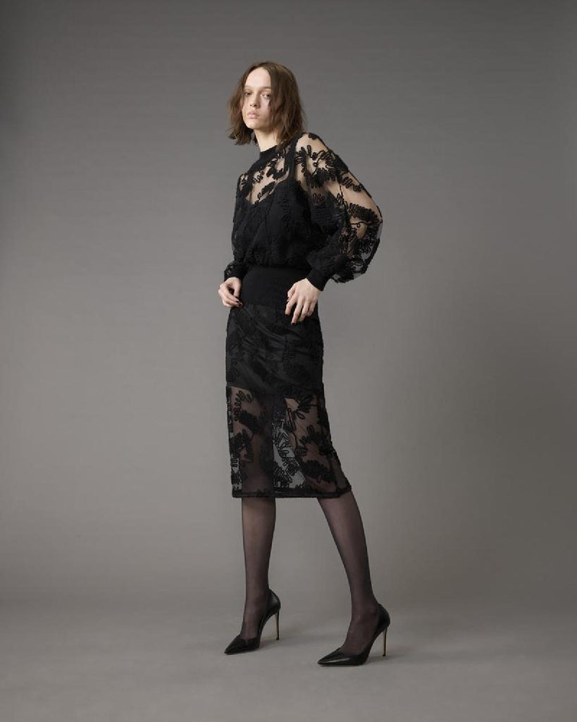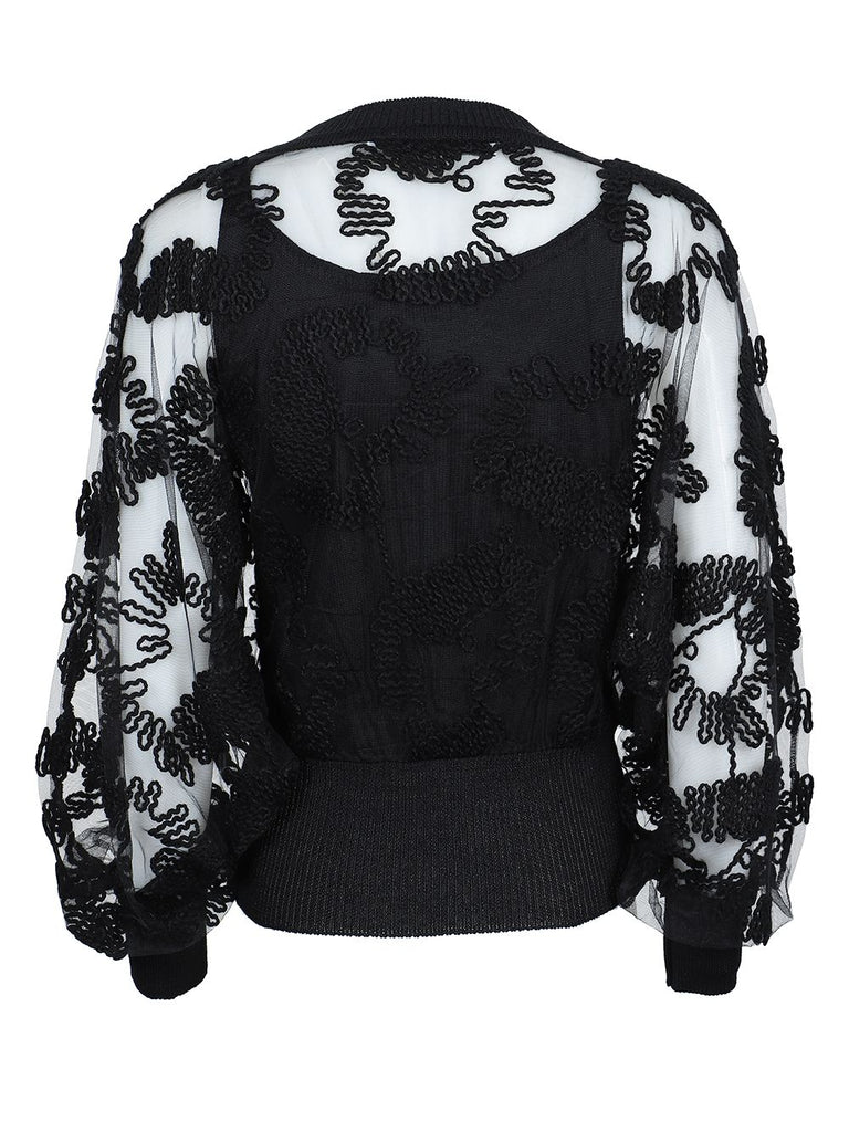 Maglia girocollo in pizzo trasparente, manica lunga con polsini , collo e fondo in maglia a costine, fornita con canotta.