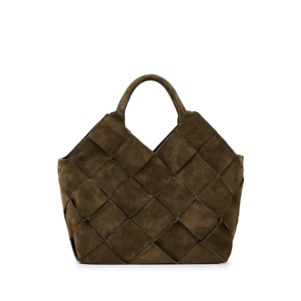 Borsa intrecciata in pelle scamosciata, borsa interna con zip, tasca interna e tracolla in pelle.
